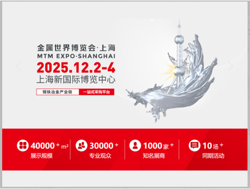 2025金屬世界博覽會(MTMEXPO)將于2025年12月2日-4日在上海新國際博覽中心盛大舉辦。本屆博覽會將以“科技創新、綠色低碳、智能制造、***集約&rd...